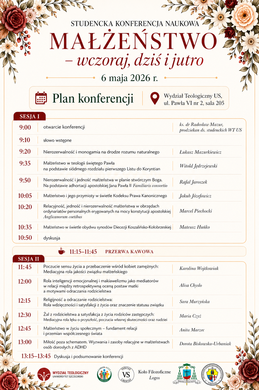 Program obejmuje wystąpienia studentów teologii, psychologii, nauk o rodzinie, podczas konferencji przewidziane są dwie dyskusje i przerwa kawowa. Konferencja zakończy się podsumowaniem ok. 13:45.